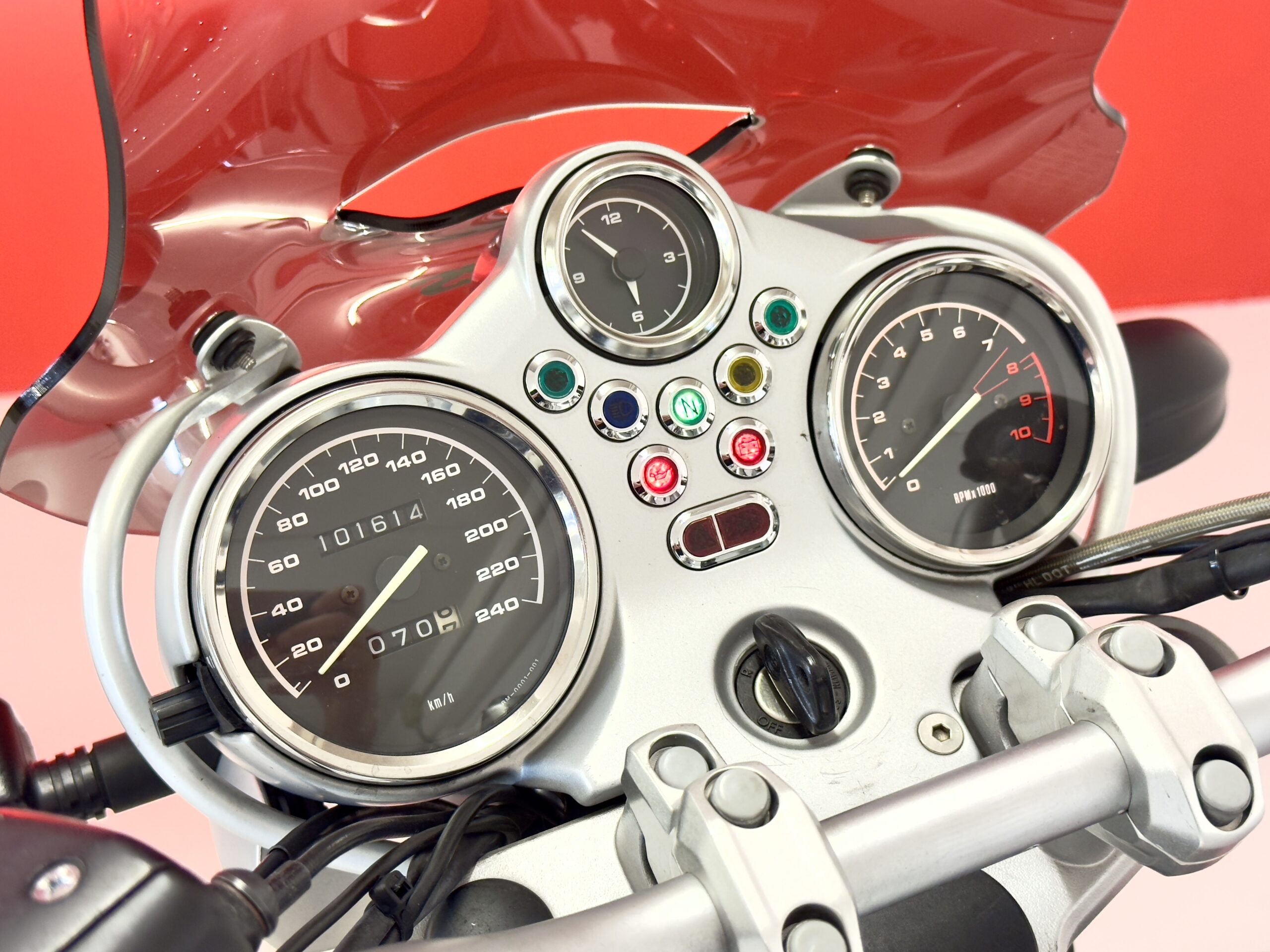Anno 2003, km.101600, perfetta in ogni dettaglio, meccanicamente perfetta, pronta all’uso. Accessori: valigie laterali originali, parabrezza WRS, scarico cromato, paracilindri, frecce bianche, cavalletto centrale, manopole riscaldabili.