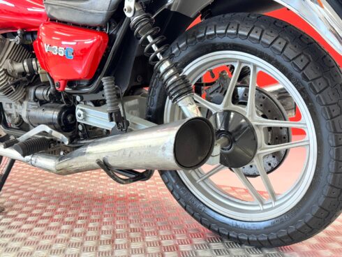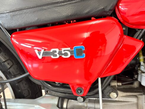 Altro modello derivato, senza sconvolgimenti telaistici, è quello di categoria custom/cruiser, cioè il mito immortale del motociclismo mondiale, che non mancava di fans neanche allora. Il V35 C (C di Custom appunto, anche se alcune scuole fanno risalire alla C l’iniziale della mitica California, cosa non inverosimile data la forma del serbatoio praticamente molto simili) aveva la seduta bassa e le padane lunghe, come su ogni custom che si rispetti. Il serbatoio affusolato (in luogo di quello squadrato montato di serie sulla normale) era simile a quello della California, che era ormai arrivata ad una cilindrata, per molti proibitiva, di 1000 cm³, la 350 fu una moto agile e comoda. Fu prodotta del 1982 al 1985.