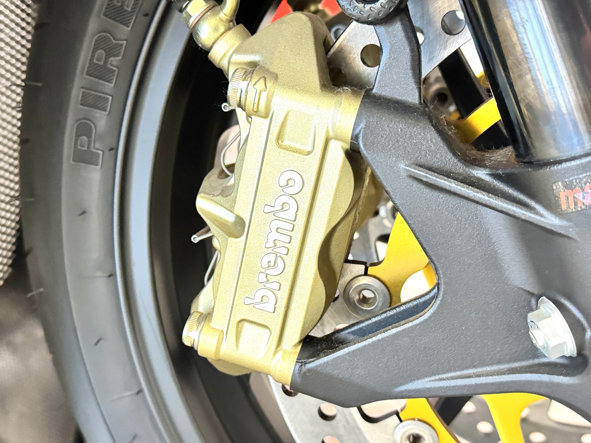 Le sospensioni sono state confermate, la Forcella Marzocchi RAC che ha steli da 50 mm trattati al TIN, e offre 13 possibilità di regolazione in compressione e 22 in estensione. Il monoammortizzatore Sachs prevede anche la doppia regolazione idraulica in compressione, ma offre anche la regolazione idraulica del precarico molla. Immancabili le ruote Brembo forgiate in alluminio con raggi a Y, leggerissime, con la mega sezione da 6 pollici al posteriore, per poter montare il gommone da 190/55 comunque già presente anche sulla R. L’impianto frenante completa la dotazione che Brembo ha assegnato alla R312, con dischi da 320 mm di diametro all’anteriore e pinze radiali P4/34 anche se la pompa resta di tipo convenzionale e non radiale come quelle montate ormai su tutte le moto della concorrenza.